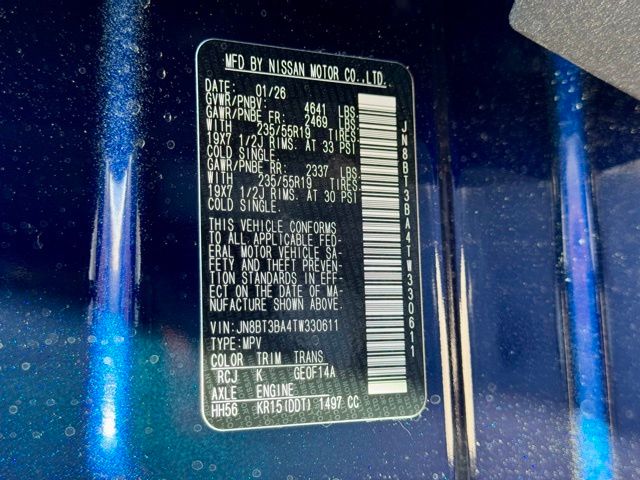 4-Wheel Disc Brakes, 6 Speakers, ABS brakes, Air Conditioning, Alloy wheels, AM/FM radio, Apple CarPlay/Android Auto, Auto High-beam Headlights, Automatic temperature control, Black Splash Guards (set of 4), Brake assist, Bumpers: body-color, Delay-off headlights, Driver door bin, Driver vanity mirror, Dual front impact airbags, Dual front side impact airbags, Electronic Stability Control, Emergency communication system: NissanConnect Services, Exterior Parking Camera Rear, Floor Mats with 1-Piece Cargo Area Protector, Four wheel independent suspension, Frameless Rearview Mirror with Universal Remote, Front anti-roll bar, Front Bucket Seats, Front Center Armrest, Front dual zone A/C, Front reading lights, Fully automatic headlights, Heated door mirrors, Heated Front Bucket Seats, Heated front seats, Heated steering wheel, Illuminated entry, Illuminated Kick Plates, Knee airbag, Low tire pressure warning, Occupant sensing airbag, Outside temperature display, Overhead airbag, Overhead console, Panic alarm, Passenger door bin, Passenger vanity mirror, Power door mirrors, Power driver seat, Power Liftgate, Power moonroof, Power steering, Power windows, Prima-Tex Leatherette Seat Trim, Radio data system, Radio: AM/FM NissanConnect, Rear anti-roll bar, Rear Parking Sensors, Rear reading lights, Rear seat center armrest, Rear side impact airbag, Rear window defroster, Rear window wiper, Remote keyless entry, Retractable Cargo Cover, Speed control, Speed-sensing steering, Speed-Sensitive Wipers, Split folding rear seat, Spoiler, Steering wheel mounted audio controls, Tachometer, Telescoping steering wheel, Tilt steering wheel, Traction control, Trip computer, USB Charging Cable Set, Variably intermittent wipers, and Wheels: 19" Black Painted and Machine Finished Alloy. Price includes: $3500 - Nissan Customer Cash. Exp. 05/04/2026 Price includes dealer added accessories.