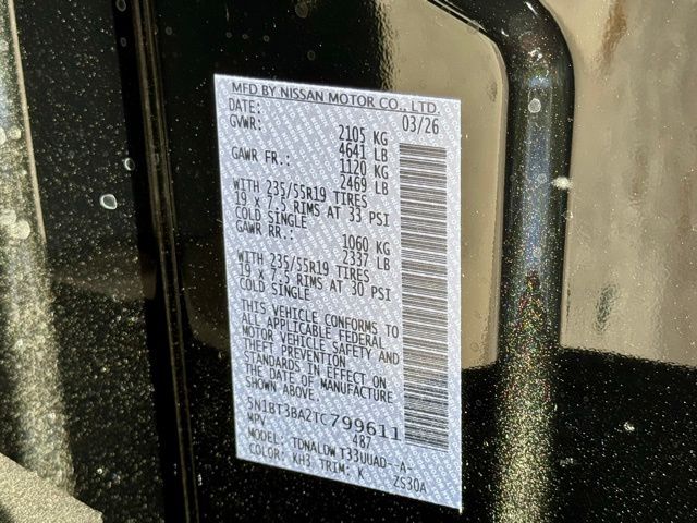 4-Wheel Disc Brakes, 6 Speakers, ABS brakes, Air Conditioning, Alloy wheels, AM/FM radio, Apple CarPlay/Android Auto, Auto High-beam Headlights, Automatic temperature control, Black Splash Guards (set of 4), Brake assist, Bumpers: body-color, Delay-off headlights, Driver door bin, Driver vanity mirror, Dual front impact airbags, Dual front side impact airbags, Electronic Stability Control, Emergency communication system: NissanConnect Services, Exterior Parking Camera Rear, Floor Mats with 1-Piece Cargo Area Protector, Four wheel independent suspension, Frameless Rearview Mirror with Universal Remote, Front anti-roll bar, Front Bucket Seats, Front Center Armrest, Front dual zone A/C, Front reading lights, Fully automatic headlights, Heated door mirrors, Heated Front Bucket Seats, Heated front seats, Heated steering wheel, Illuminated entry, Illuminated Kick Plates, Knee airbag, Low tire pressure warning, Occupant sensing airbag, Outside temperature display, Overhead airbag, Overhead console, Panic alarm, Passenger door bin, Passenger vanity mirror, Power door mirrors, Power driver seat, Power Liftgate, Power moonroof, Power steering, Power windows, Prima-Tex Leatherette Seat Trim, Radio data system, Radio: AM/FM NissanConnect, Rear anti-roll bar, Rear Parking Sensors, Rear reading lights, Rear seat center armrest, Rear side impact airbag, Rear window defroster, Rear window wiper, Remote keyless entry, Speed control, Speed-sensing steering, Speed-Sensitive Wipers, Split folding rear seat, Spoiler, Steering wheel mounted audio controls, Tachometer, Telescoping steering wheel, Tilt steering wheel, Traction control, Trip computer, USB Charging Cable Set, Variably intermittent wipers, and Wheels: 19" Black Painted and Machine Finished Alloy. Price includes: $3500 - Nissan Customer Cash. Exp. 05/04/2026 Price includes dealer added accessories.