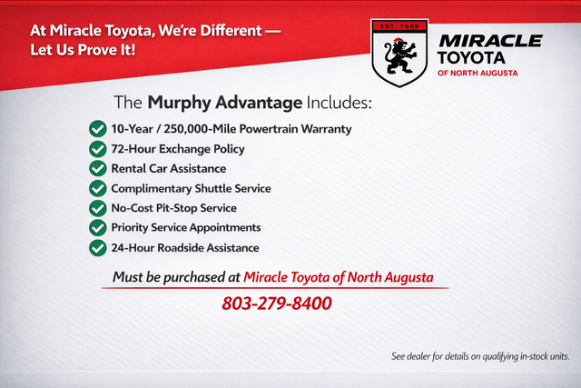 At Miracle Toyota, We’re Different, Let us prove it!! The Murphy Advantage includes: *7 year / 250,000 powertrain warranty* (Vehicle age max 8 yrs / under 85k miles) *72 hr exchange policy* *rental car assistance* *no cost shuttle service* *no cost pit-stop service* *priority service appointments* *24 hour road side assistance*